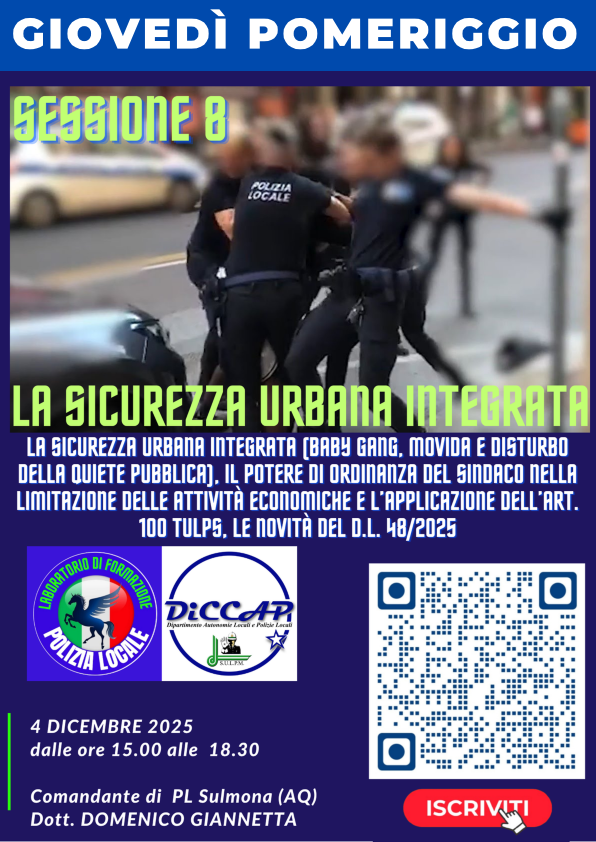 14 DICEMBRE 2023 - SICUREZZA URBANA INTEGRATA: BABY GANG, MOVIDA E DECRETO CAIVANO - PER ISCRIZIONE CLICCA QUI