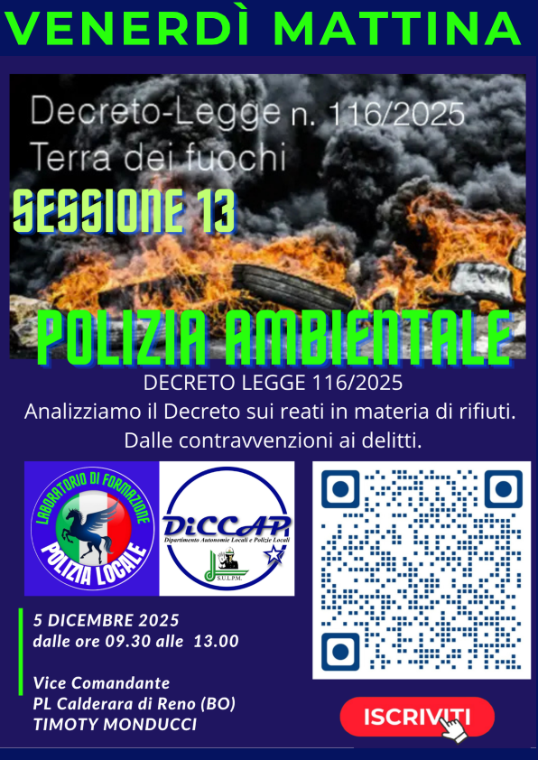 14 DICEMBRE 2023 - I PRINCIPALI REATI AMBIENTALI: ANALISI E PROCEDURE OPERATIVE DI CONTROLLO PER L'OPERATORE DI POLIZIA. NORMATIVA AMBIENTALE E CONTROLLO STRADALE
