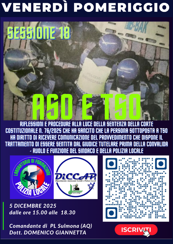 14 DICEMBRE 2023 - ASO E TSO: IL RUOLO E LA FUNZIONE DELLA POLIZIA LOCALE E DEL SINDACO - PER PARTECIPARE CLICCA QUI