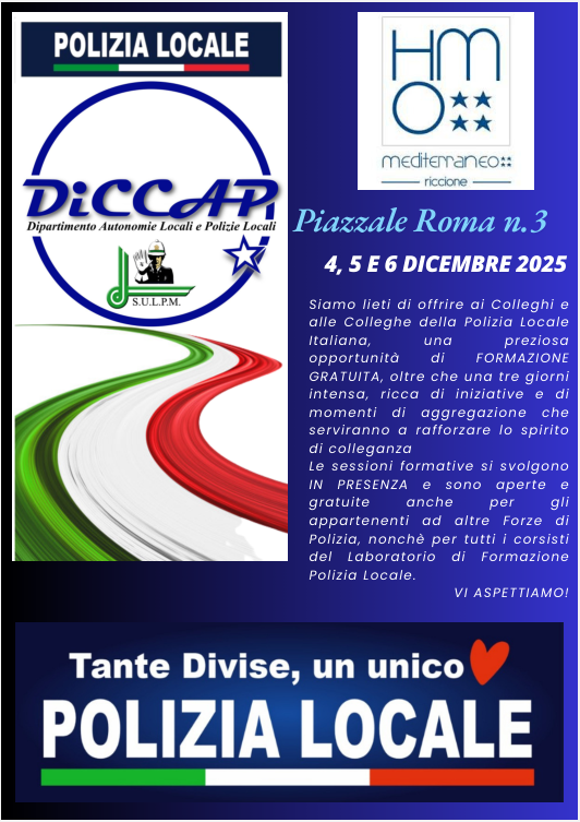 Giornata di Formazione per la Polizia Locale 1, 3 e 4 luglio 2025 su piattaforma ZOOM